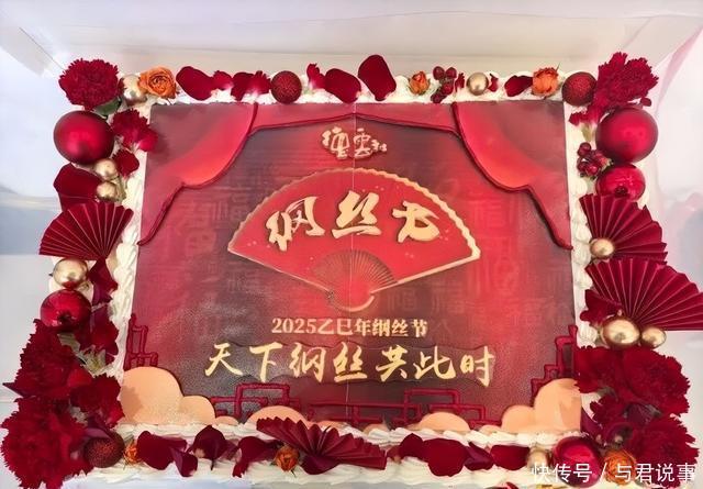 蛋糕很精美,很喜庆,很诱人,让人不想去破坏掉。蛋糕是长方形,四周用花边、折扇等点缀。中央,倒是德云社“纲丝节”海报上半部分直接的“印刷”。 从上到下,“德云社”这三字下是一把折扇,上写“纲丝节”。折扇下方是“2025乙巳年纲丝节”。在下面是“天下纲丝共此时”。 但凡在节日演出,德云社都会准备一个蛋糕。特别是切蛋糕,与观众互动的环节,更是非常的有意思。谁拿蛋糕砸观众了,谁站在师父面前保护了,都会成为第二天的热门话题。